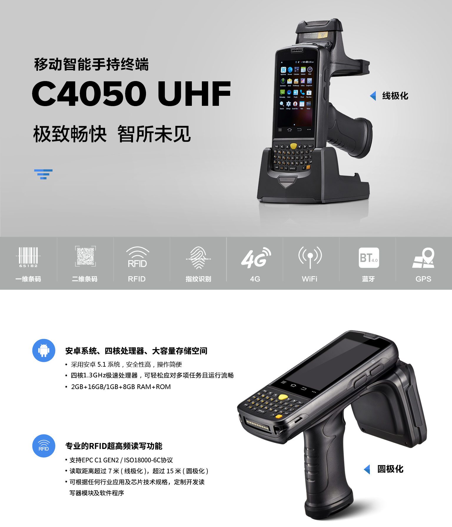 深圳成為C4050 UHF RFID 手持終端是一款超高頻工業級智能手持終端。基于Android 5.1操作系統,搭載高性能四核處理器,配備可拆卸電池且支持電池手柄,運行快速且續航持久。集成性能優異的UHF RFID功能,標簽識讀精準快速,室外空曠環境讀距超過15米,且支持標簽群讀,同時可選配高性能條碼功能,現廣泛應用于零售連鎖、物流快遞、服裝管理、倉儲管理、能源化工等領域。