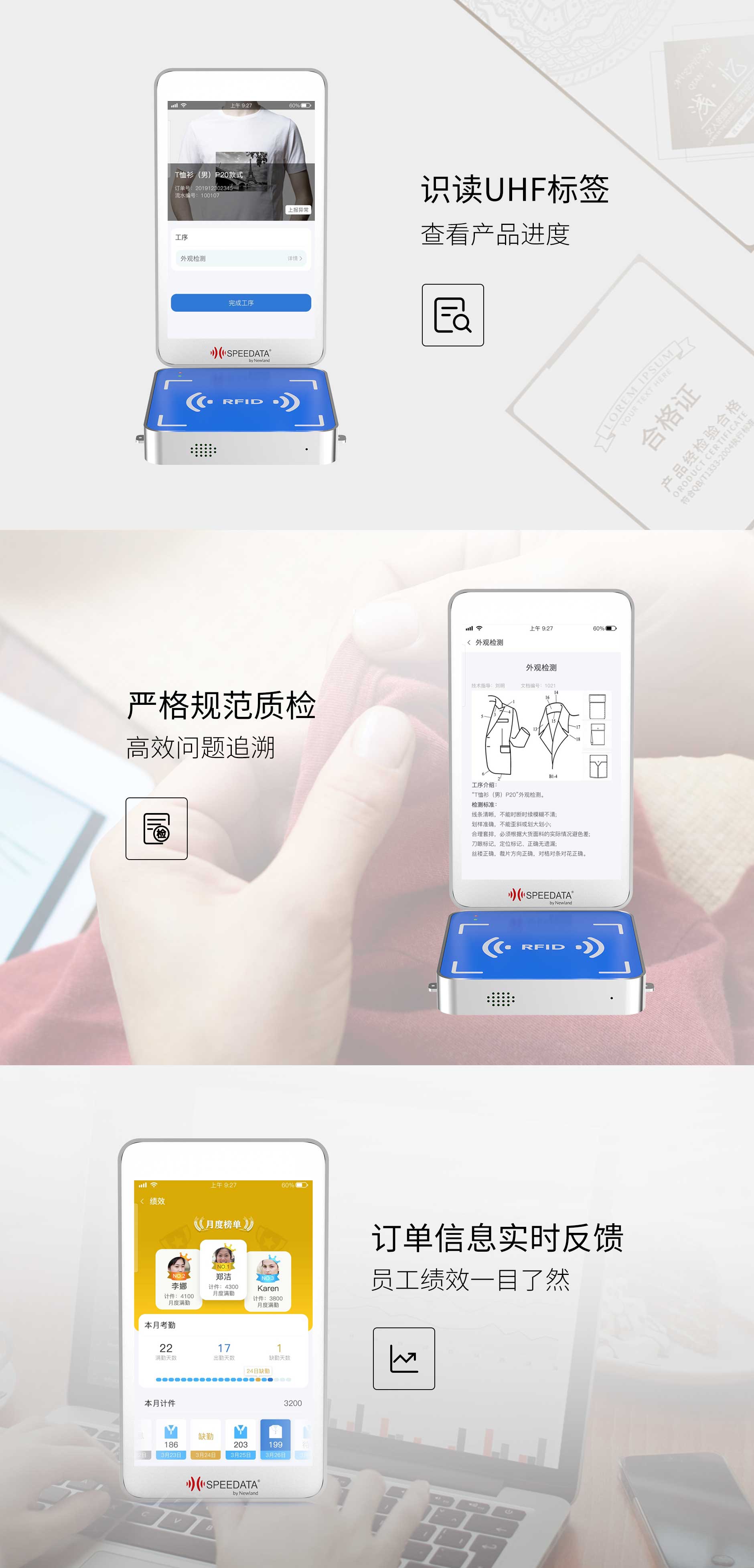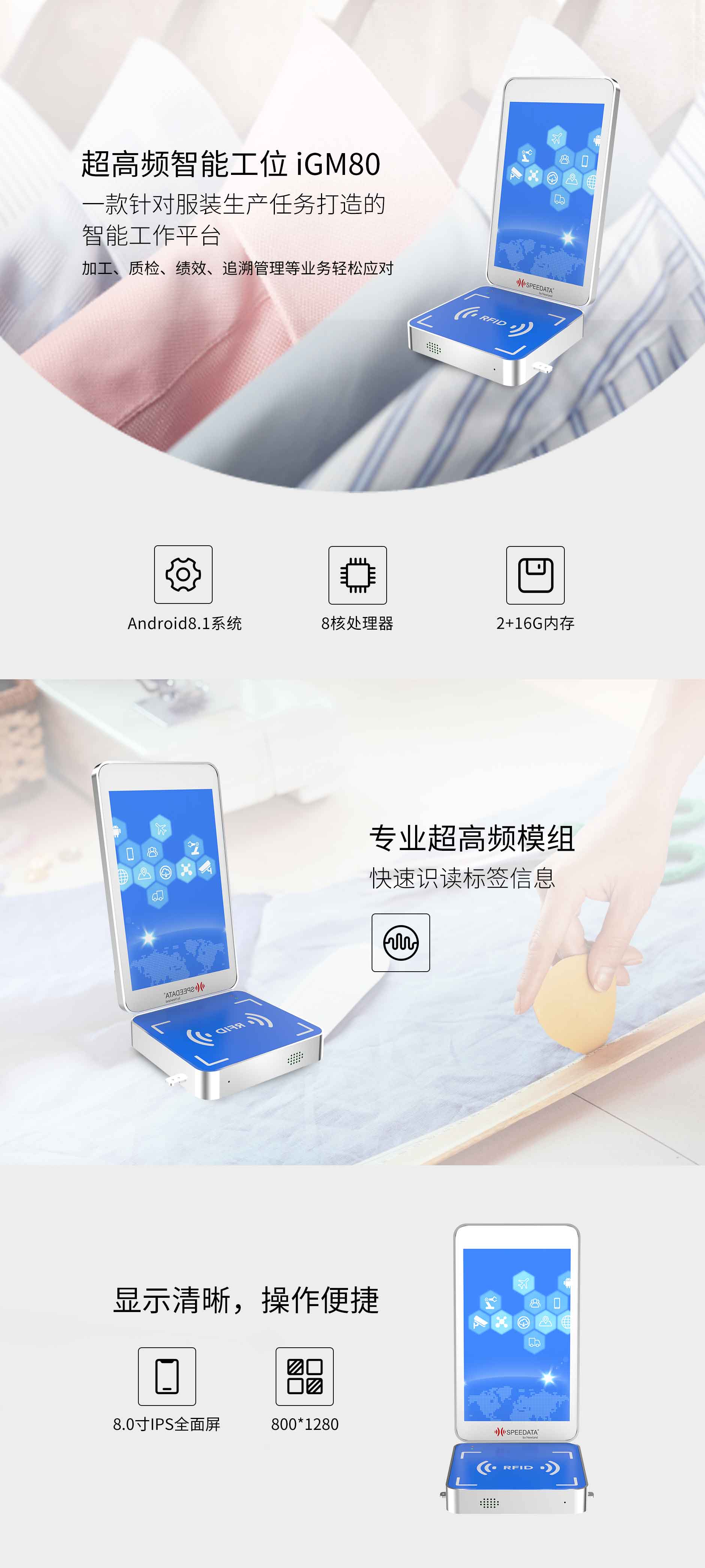 iGM80高頻智能工位是一款針對服裝生產(chǎn)任務(wù)打造的智能工作平臺。8.0寸IPS面屏,顯示清晰,操作便捷。加工、質(zhì)檢、績效、追溯管理等業(yè)務(wù)輕松應(yīng)對。專業(yè)高頻RFID模組,快速識別標(biāo)簽信息。完善的SDK,支持二次開發(fā)。