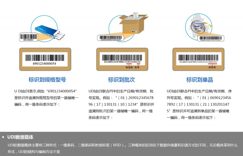 Unique device identification (UDI) 是美國食品藥物管理局FDA建立的”特殊醫療器械的識別系統”,該注冊碼的實施是為了有效識別在美國市場上銷售并使用的醫療器械,無論其生產地在哪里。一旦實施,NHRIC和NDC標簽將廢止,所有的醫療器械都需要將這個新的注冊碼作為標識貼在產品的外包裝上。除了滿足可見(visible)之外,UDI必須滿足純文本形式和自動識別技術(automatic identification and data capture, AIDC). 器械的標簽負責人員也必須將每個產品的確實信息發送到“FDA國際特殊醫療器械識別庫UDID”內,使公眾可以通過訪問該數據庫查詢并下載相關數據(包括從生產,分銷到客戶使用情況的信息等),但該數據庫不會提供器械使用者的信息。