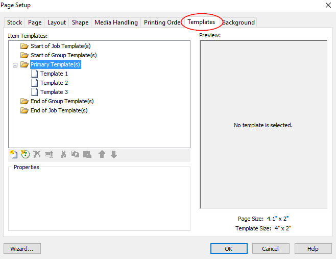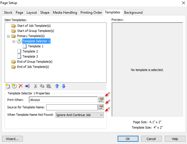 在“ 模板選擇器屬性” 部分中,指定包含要在“ 模板名稱源” 字段中打印的模板名稱的數據庫字段或數據源值。